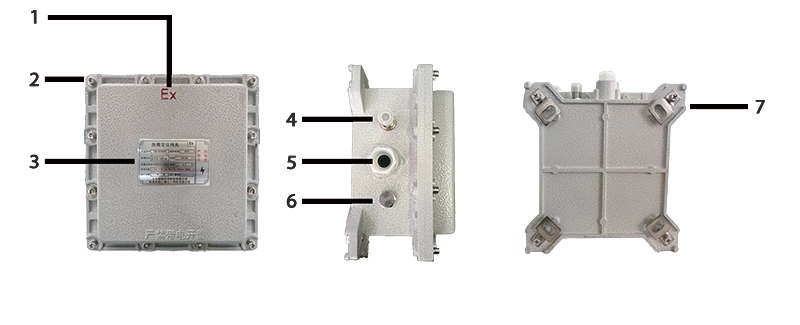 1.防爆標(biāo)識(shí) 2.固定孔 3.銘牌標(biāo)示 4.LoRa天線接頭 5.電源線、網(wǎng)線出線孔 6.4G/5G天線接頭 7.設(shè)備固定孔